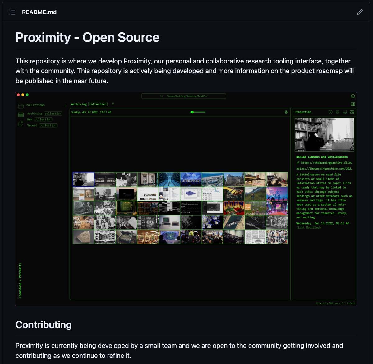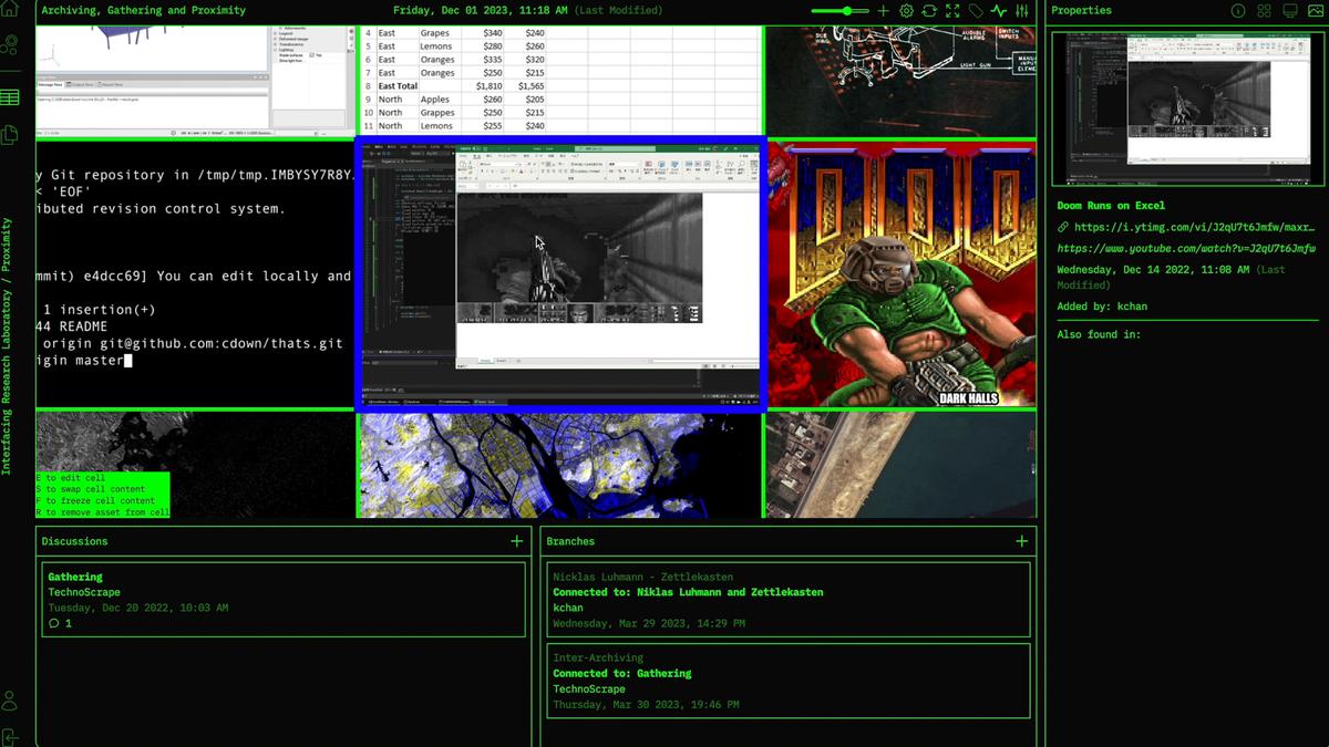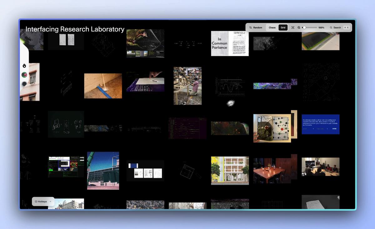 Proximity operates as a digital greenhouse for ideas. Visual grids bring fragments into relation through Rigid, Chaos, and Stacks views. Multi-cell linking traces semantic trails across time, people, and topics. Sketchbook annotation layers personal marks and collaborative notes directly on the grid. Teams, commenting, and gating create contexts for private work, small groups, or public rituals. Ambient AI offers quiet assistance through semantic tagging, discovery, and cross-grid suggestions. Presenter Mode lets ideas be shared as living arguments instead of flattened slides. Push–pull integration with Are.na ensures continuity and fidelity across platforms.